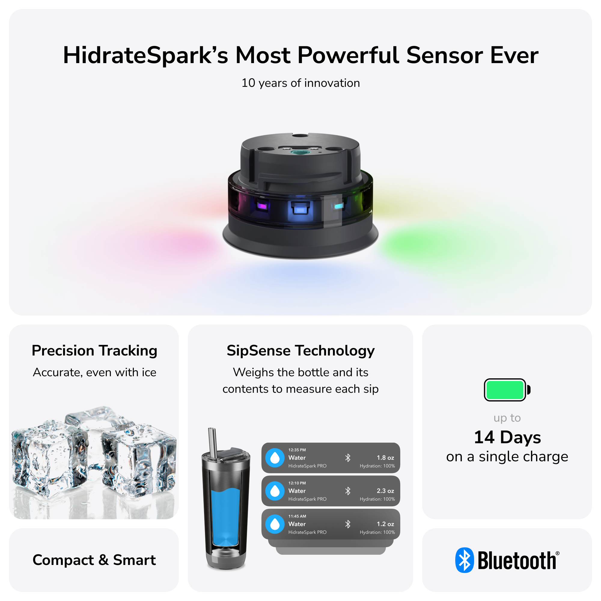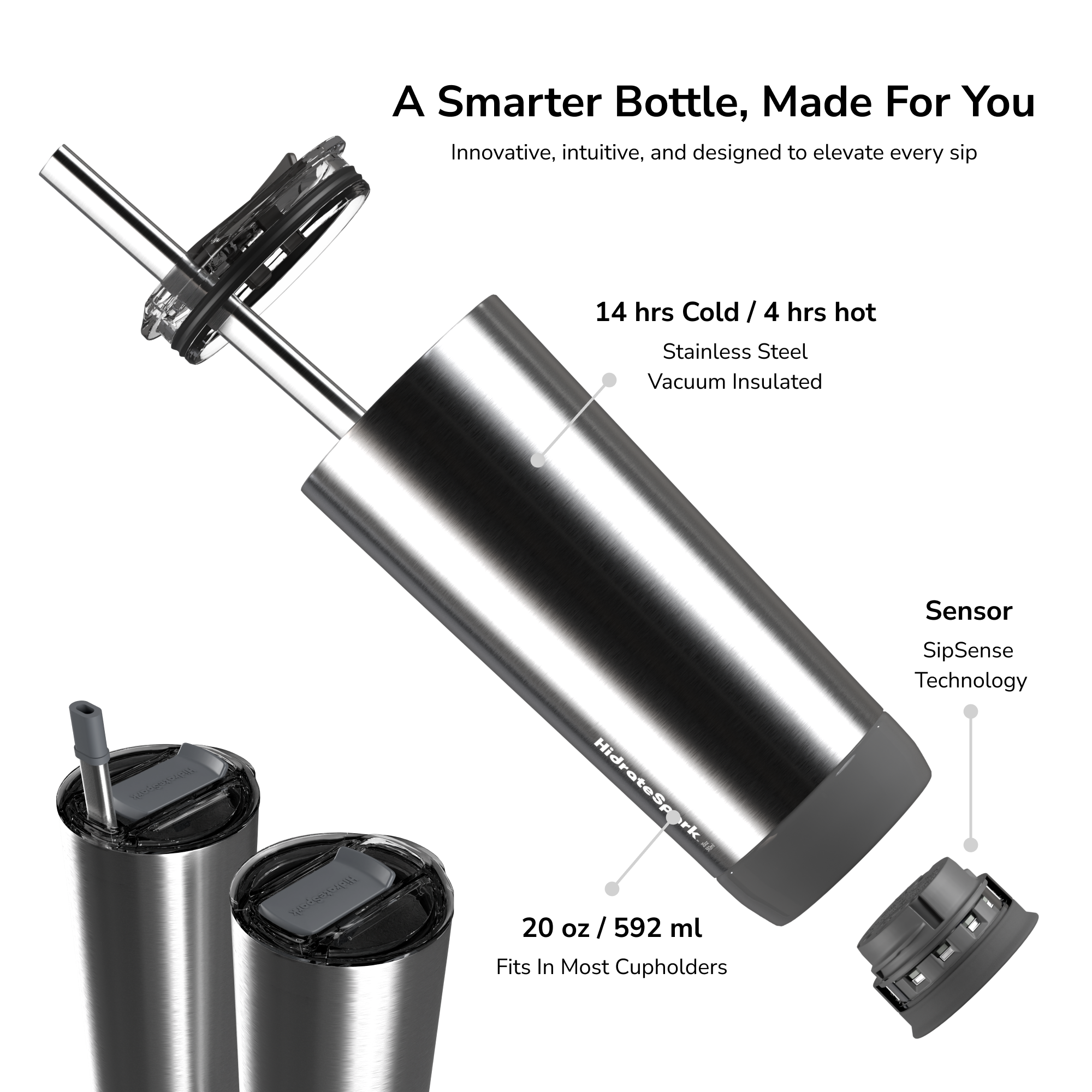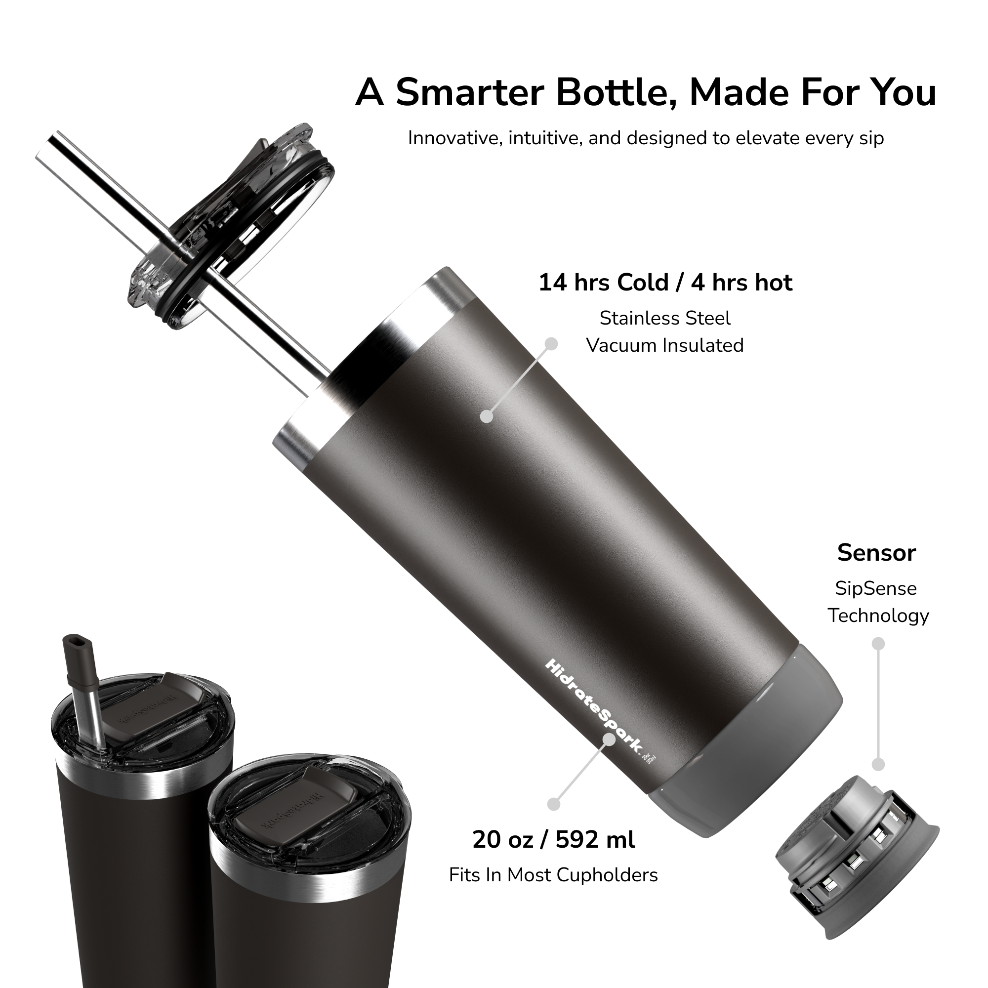The world’s smartest tumbler ever created. Powered by SipSense technology, the sensor at the base glows to remind you when it’s time to drink and tracks your water intake by syncing via Bluetooth to the HidrateSpark App. Vacuum-insulated stainless steel keeps drinks cold for up to 14 hours and hot for up to 4 hours.